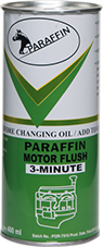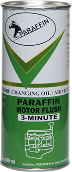 PARAFFIN MOTOR Flush is a specially formulated combination of additives and carrier fluid. In combination with the carrier fluid, the highly effective detergent and dispersant additives dissolve sludge and lacquer formers. All types of oil-soluble and oil insoluble residues are brought into suspension and removed during the next oil change. An engine which has been cleaned of deposits and contamination and which is then filled with fresh oil not contaminated with old impurities can develop its full performance characteristics