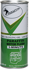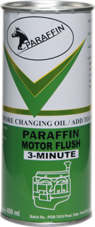 PARAFFIN MOTOR Flush is a specially formulated combination of additives and carrier fluid. In combination with the carrier fluid, the highly effective detergent and dispersant additives dissolve sludge and lacquer formers. All types of oil-soluble and oil insoluble residues are brought into suspension and removed during the next oil change. An engine which has been cleaned of deposits and contamination and which is then filled with fresh oil not contaminated with old impurities can develop its full performance characteristics
